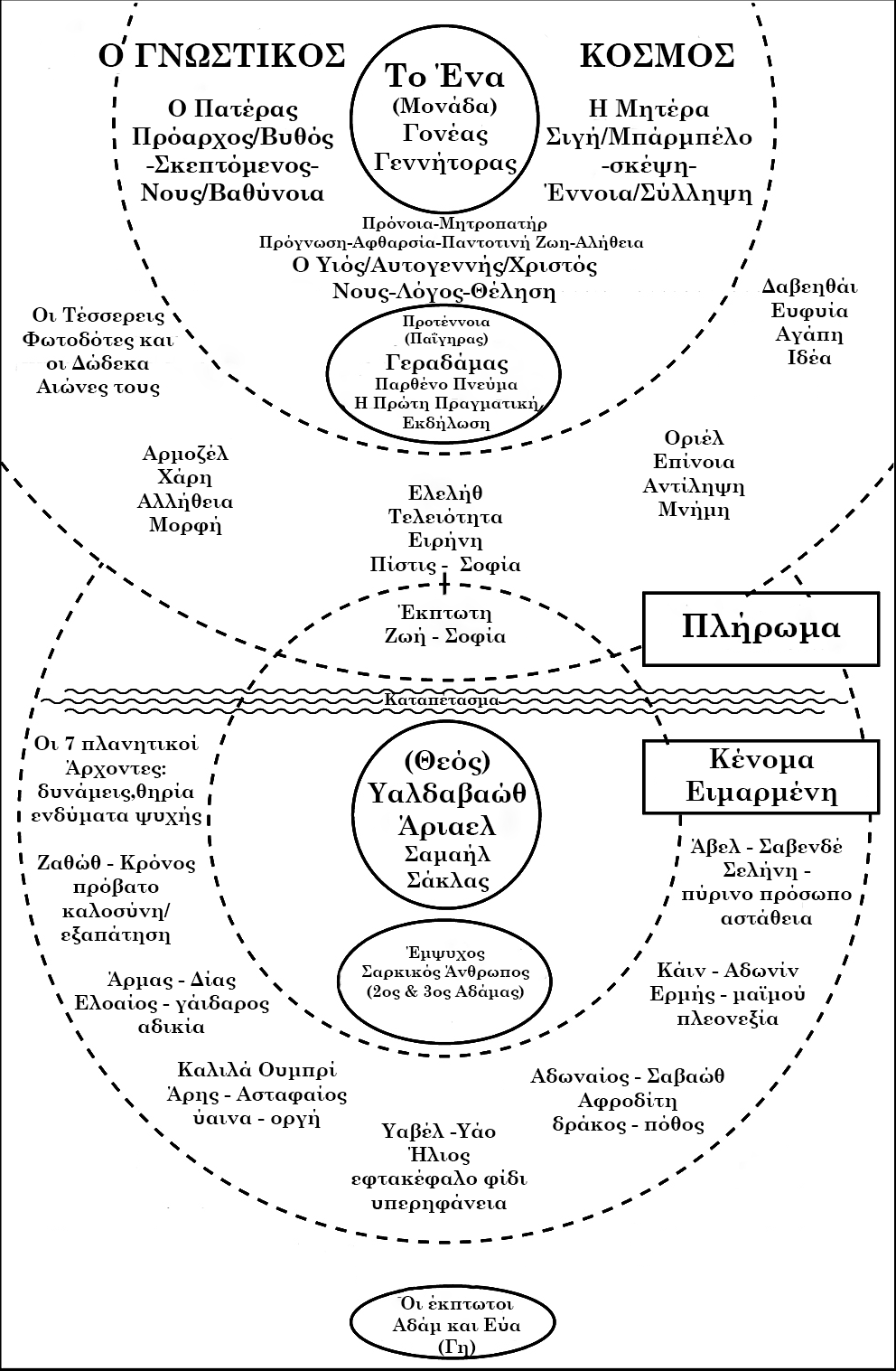 Μια βασική ανατρεπτική θέση των γνωστικών είναι ο σαφής διαχωρισμός του Θεού-Πνεύματος(Μονάδα) με τον δημιουργό-θεό όλων των θρησκειών, και τους κόσμους στους οποίους κατοικούν: στο Πλήρωμα, και στο Κένομα ή Ειμαρμένη. Σε γενικές γραμμές η ενασχόληση με τα θέματα των Γνωστικών για όσους έχουν κατασταλάξει σε κάποιο επιστημονικό, φιλοσοφικό ή θρησκευτικό δόγμα θα είναι από τελείως άχρηστη έως εξαιρετικά επικίνδυνη και προτείνεται αυστηρά να μην συνεχίσουν. Οι ιστορίες τους δεν χαϊδεύουν τα αυτιά. Μπορεί να μην είναι αλήθεια αυτά που περιγράφουν μα είναι ακριβείς για τις πρωταρχικές έννοιες που συνθέτουν τον καμβά της ανθρώπινης σκέψης και της προέλευσής της. Όμως υπάρχει έμφυτη στον προγραμματισμό μας η αποτροπή της ενθύμησης αυτής.